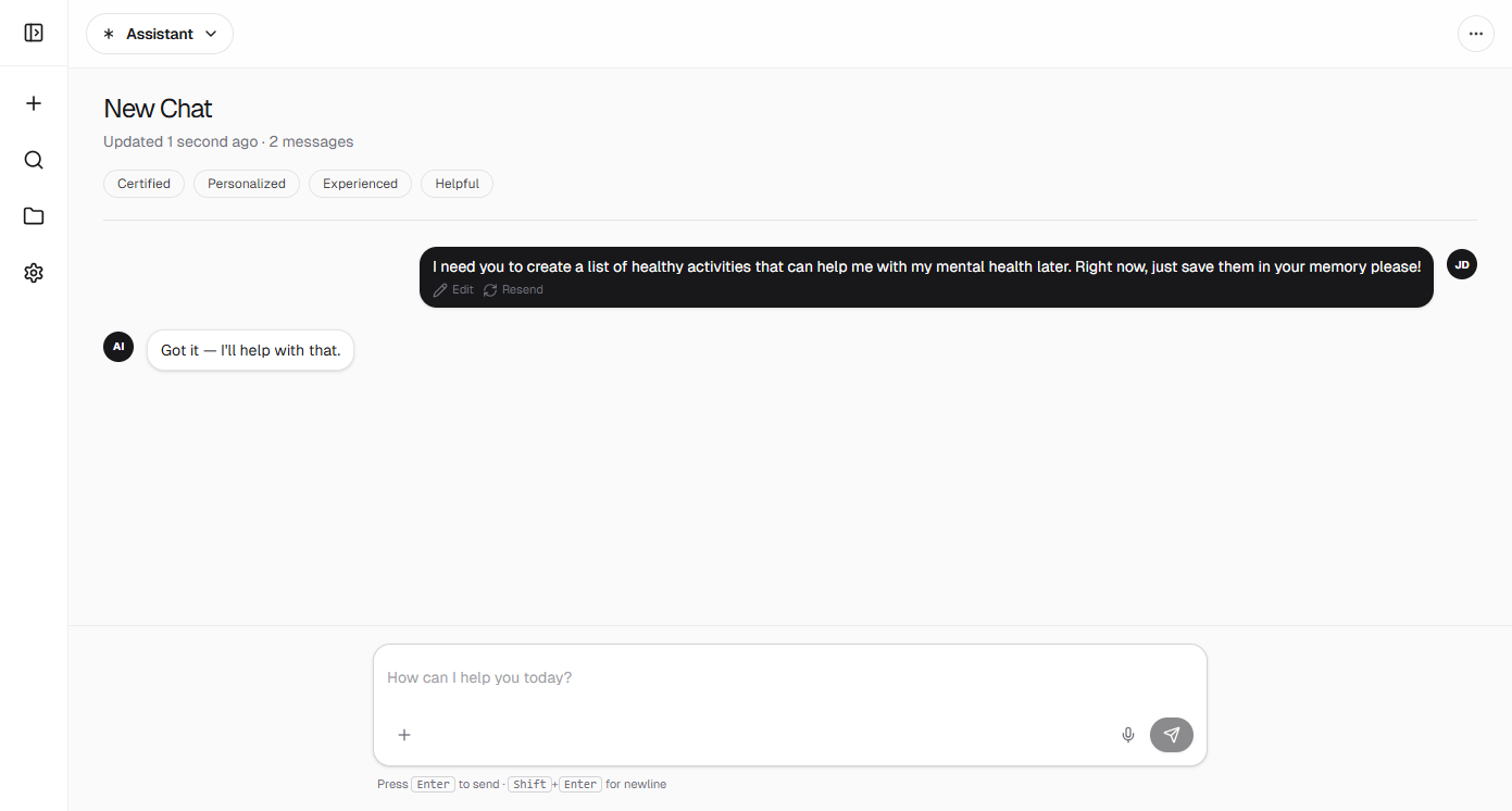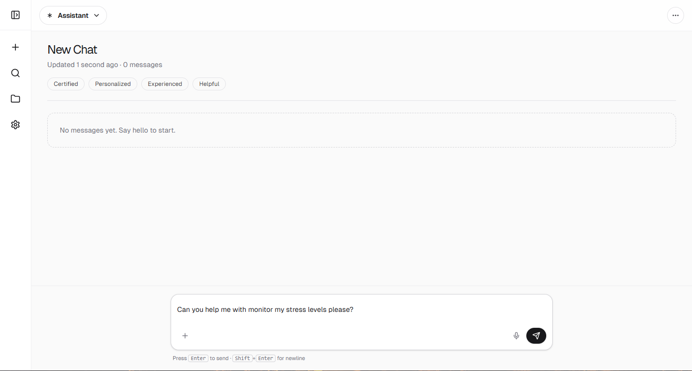 MindEase shines with AI conversations that evolve based on user input, covering relaxation techniques, workload stress, and emotional check-ins. A built-in confidence scoring system verifies response accuracy, while the clean interface allows effortless topic switching and session history access.